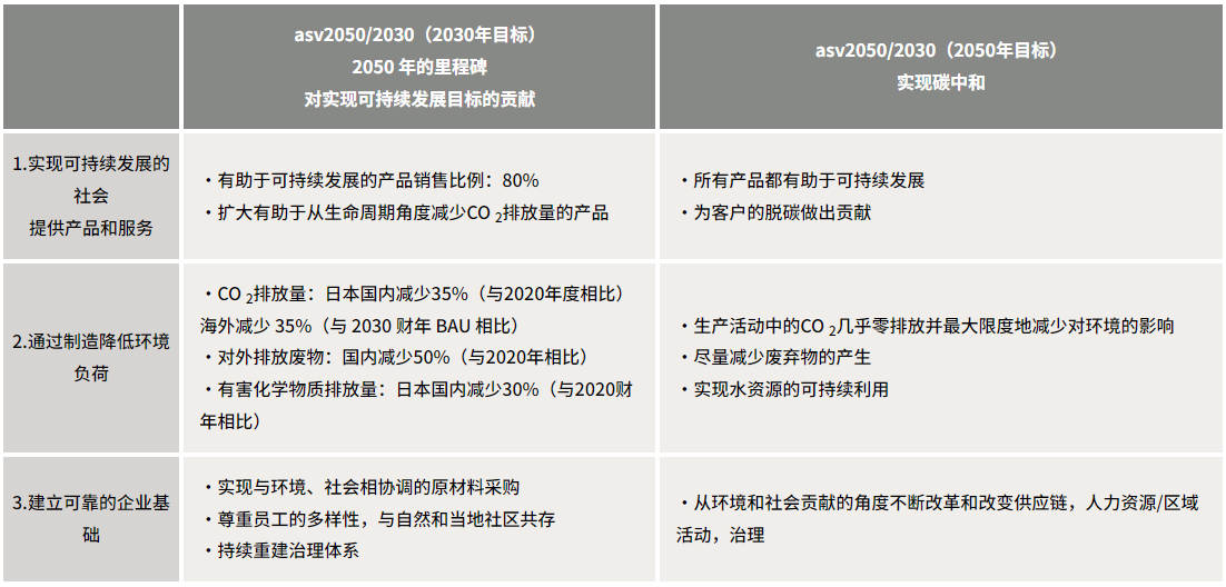 ASV2050/2030由兩部分組成:“ASV2050”,展示以2050年為目標年的理想狀態(tài);“ASV2030”,將2030年目標作為里程碑進行回溯。本集團以環(huán)境目標(SIC-II目標)和中長期目標“ASV2050/2030”為可持續(xù)發(fā)展活動指標,強化努力,力爭在2050年實現(xiàn)“碳中和”。