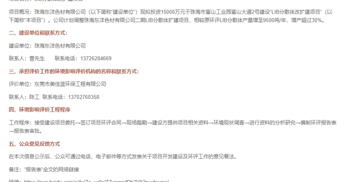 珠海東洋色材有限公司項(xiàng)目環(huán)評(píng)公示
