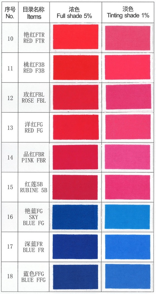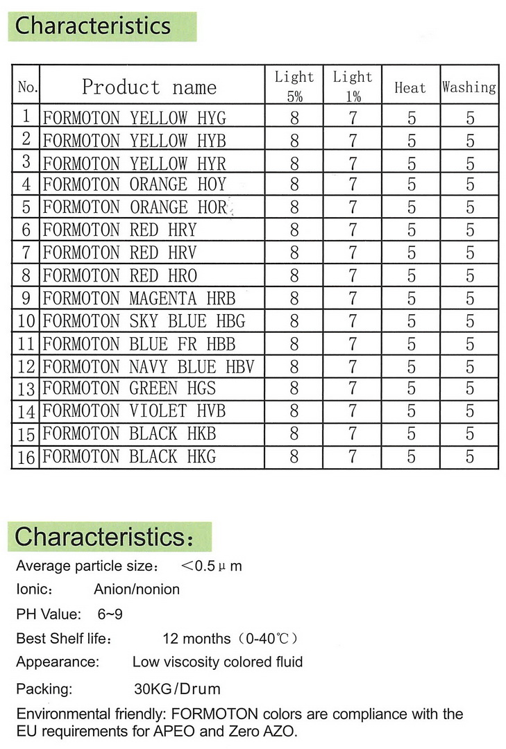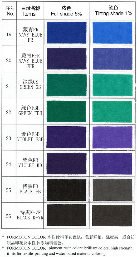 可用于天然纖維織物,如棉纖維織物;人造與合成纖維織物,如聚酰胺(尼龍)、聚酯、醋酸纖維(人造絲)等,以及以上各種纖維交織或混紡織物,如棉和聚酯混紡之印染上。